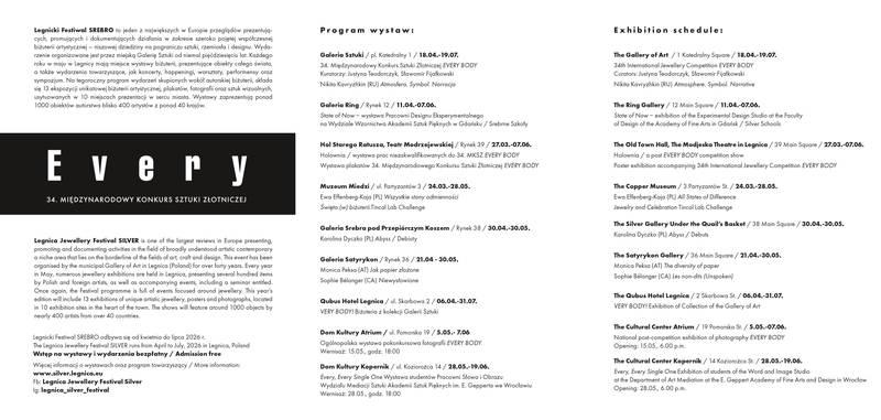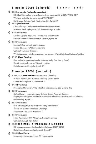 W tym roku do programu Weekendu Otwarcia trafiły wernisaże wystaw, performanse studenckie, koncert, seminarium teoretyczne „Granice Sztuki Globalnej” oraz ceremonia wręczenia nagród w 34. Międzynarodowym Konkursie Sztuki Złotniczej EVERY BODY. Nieuchwytną częścią programu pozostanie z pewnością unikalna atmosfera Festiwalu, który od lat przyciąga artystów i miłośników biżuterii artystycznej z niemal całego świata.